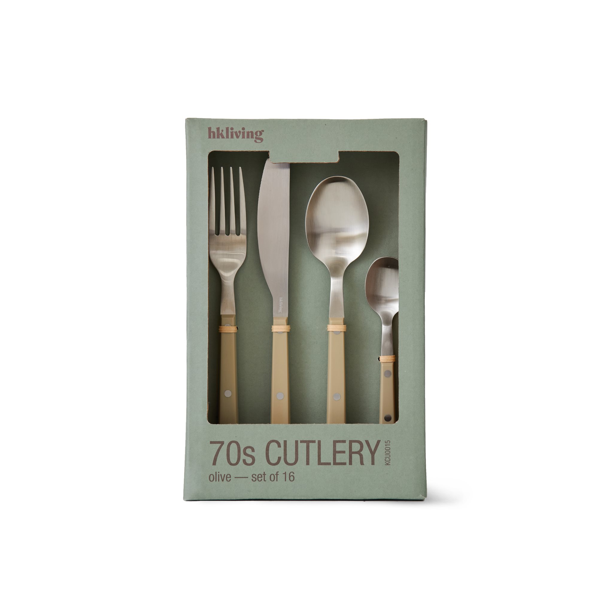 Elke set bestaat uit 4 lepels, 4 messen, 4 vorken en 4 dessertlepels.