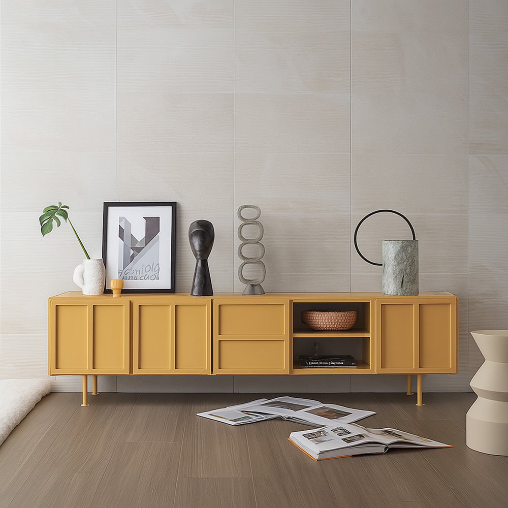 Omschrijving: Metalen tv-dressoir met open vak en 4 deuren. Ambachtelijk gemaakt met vintage look in de kleuren zand, mosterd, terra of olijfgroen.