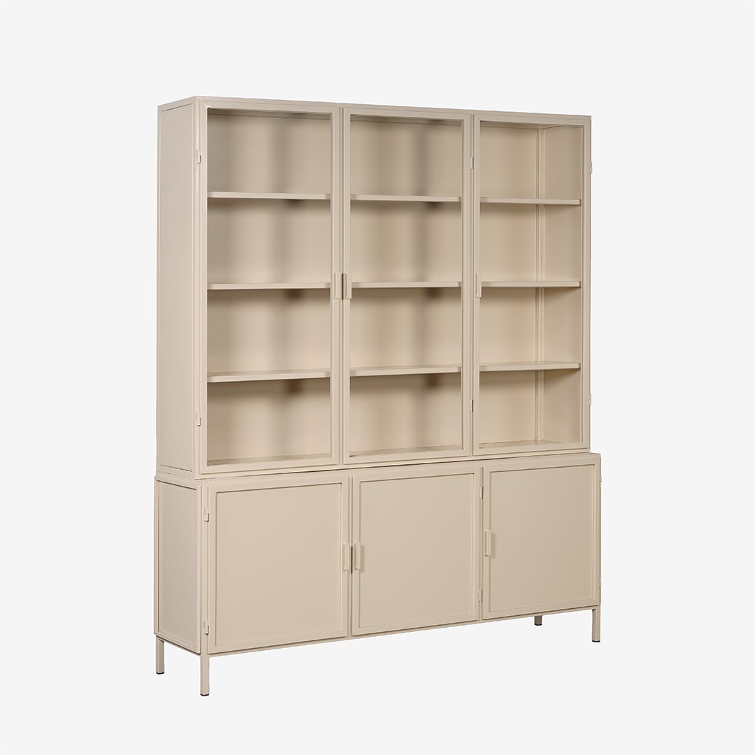 Ruime metalen vitrinekast met 6 deuren. Ambachtelijk gemaakt met vintage look verkrijgbaar in de kleuren zwart, olijfgroen of terra met helder glas in de bovenste deuren.