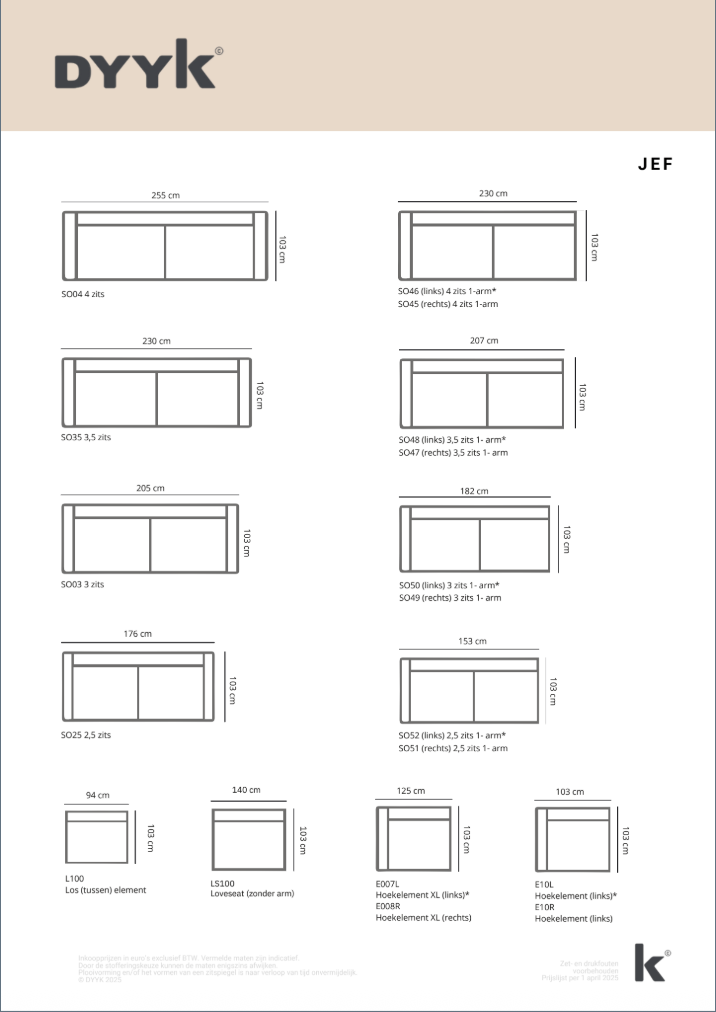 Opstelling zie Afbeelding; 2,5 zits met 1 arm/ Dormeuse