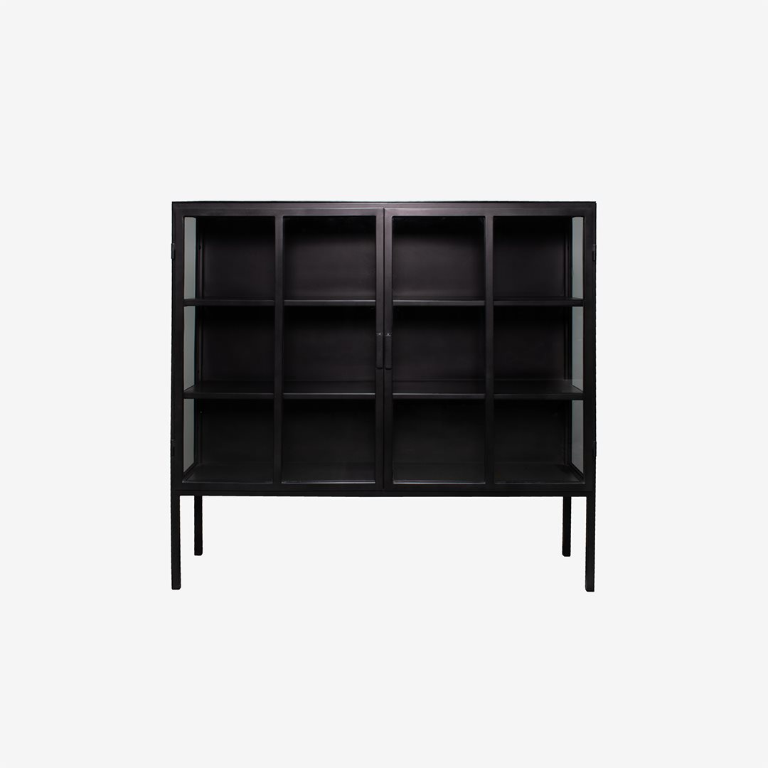 Omschrijving: Ambachtelijk gemaakte metalen vitrinekast met 2 deuren in vintage olijfgroen, zandkleur, diep blauw of zwart. De deuren en zijkanten zijn voorzien van helder glas met binnenin metalen planken. De stijlvolle vitrinekast op hoge poten oogt ruimtelijk en speels, wat bijvoorbeeld ook weer ideaal is voor kleinere ruimtes.