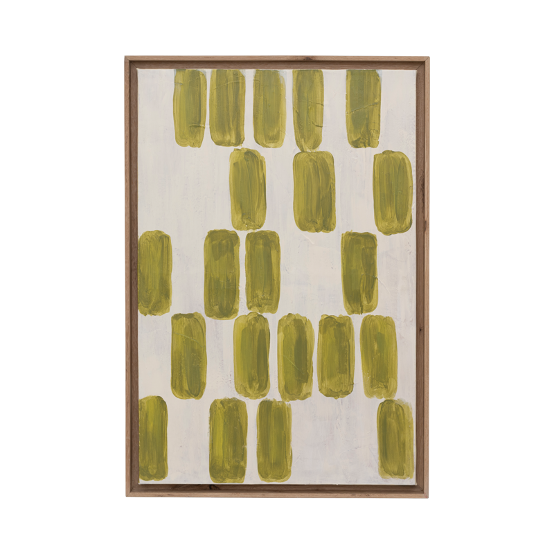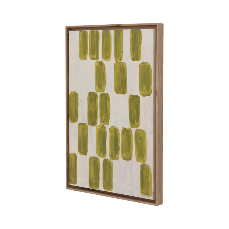 Deze abstracte wandkunst brengt een kalmerende, creatieve aanwezigheid in elke ruimte. Handgeschilderd en omlijst met eikenhout, heeft het organische groene strepen die een natuurlijke, moeiteloze uitstraling oproepen. Een onderscheidend stuk dat schoonheid en harmonie toevoegt aan je wanddecoratie.